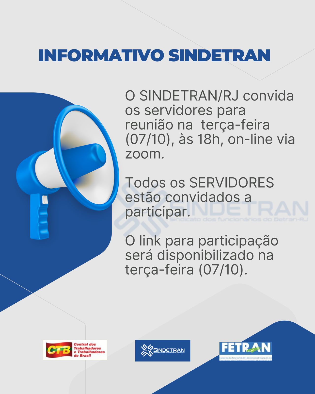 O SINDETRAN/RJ convida os servidores para reunião na terça-feira (07/10), às 18h, on-line via zoom.